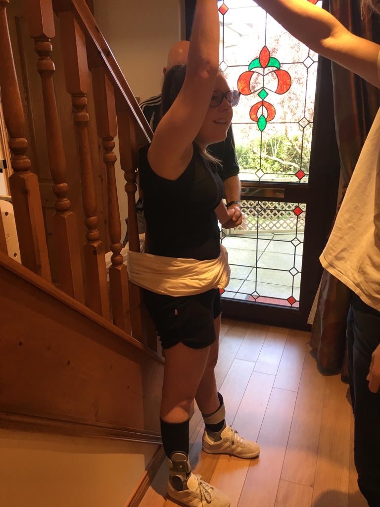 I had physio Victoria this morning and it was so good as usual! Today we tied me up to the bannister so I could practice my balance and stability! Here are some interesting photos…don’t worry it was restraint i gave permission for!