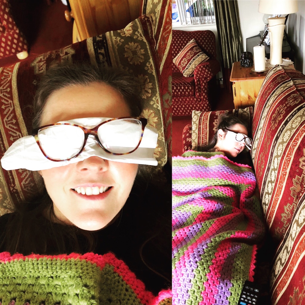 Had a wee nap in the living room today for my wee busted brain was tired. I couldn’t close the curtains so the tissue was my homemade pocket size version of curtains! 😆😝!
