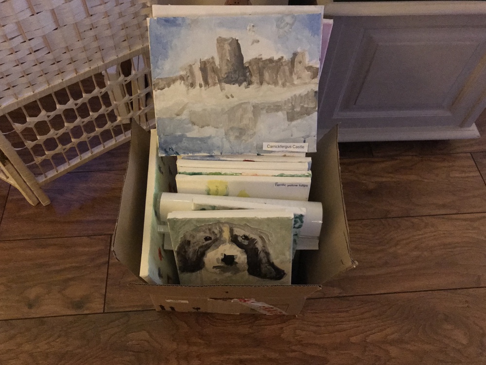 So this afternoon I was organising my art work to pass on to my neighbour (thank you Michael🙏🏻) who works in Tullycarnett library and has organised for me to display my brain injury art work for me to raise awareness and help support a brain injury charity!