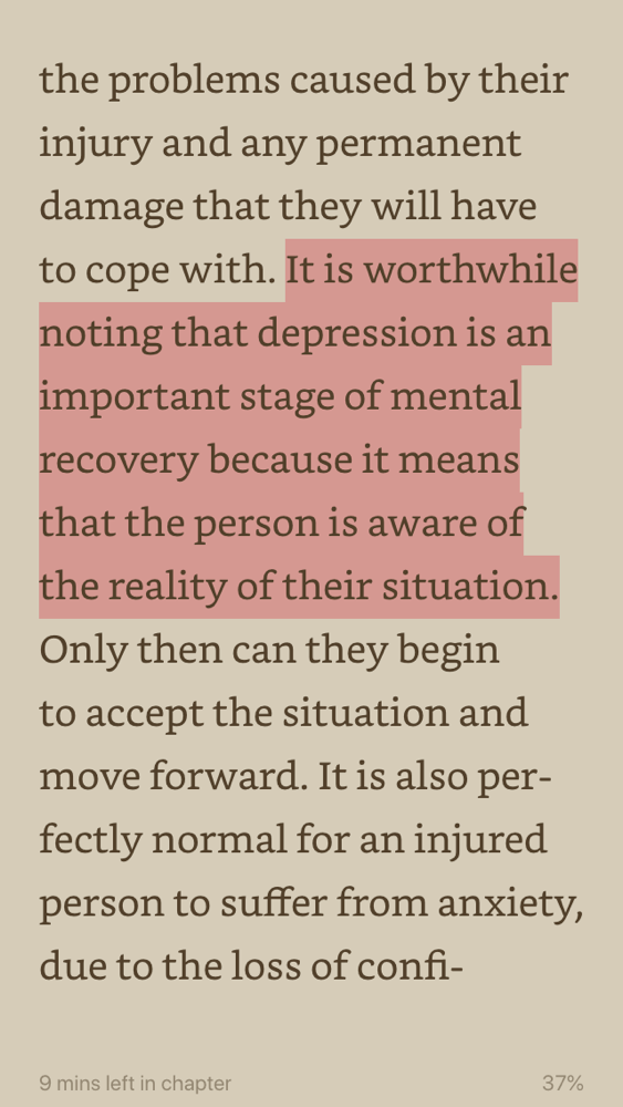 I was reading Gemma’s book again tonight. This line really jumped out at me. I totally agree with this but I think it is ‘a good’ reason to feel slightly depressed. I definitely felt a bit down in the early days of recovery as I felt that ‘life’ had taken a lot away from me. But I think at the same time it made me grow mentally through realising my situation and leading to being stronger in my head. Mental recovery. I feel much stronger mentally and ‘ready for anything!’