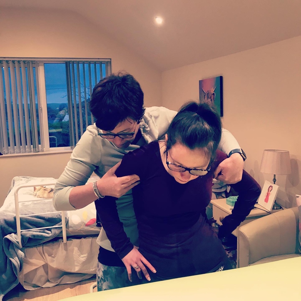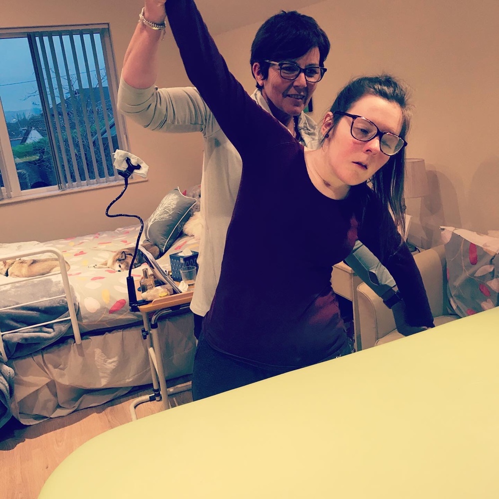 Standing with the safety of Sarah behind me doing a standing yoga session designed specially for me by the great @yogawithdenis – he understands I need to stand as much as possible to get my legs strong for walking after 3 years of not wondering about! Hence the great session of standing yoga!