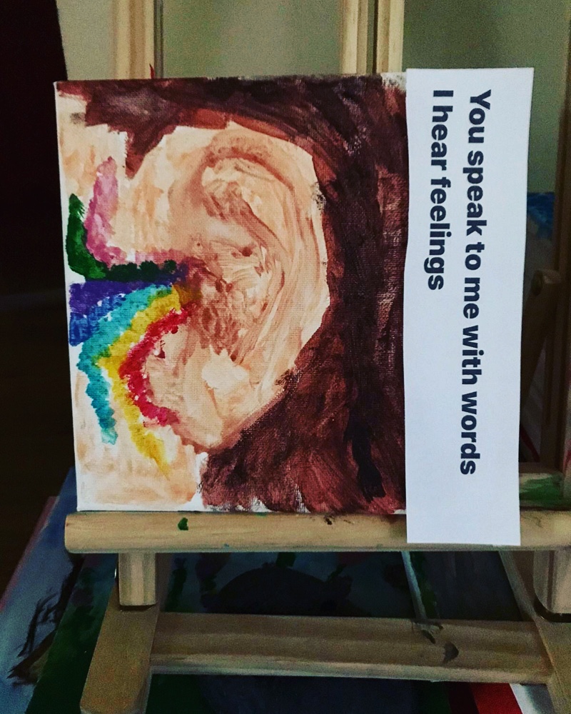 I painted this piece using those words as influence. The colours coming into the ear represent different emotions the individual hears. 🖤