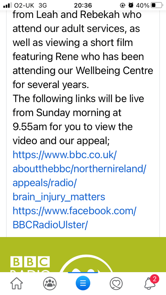 Posted on May 29, 2021May 30, 2021 by RebekahEmily Listen out for me on radio ulster tomorrow! (I haven’t heard it so it may be cringe central 😬 🤪) https://www.bbc.co.uk/aboutthebbc/northernireland/appeals/radio/brain_injury_matters Share this: Click to share on X (Opens in new window) X Click to share on Facebook (Opens in new window) Facebook Like Loading...