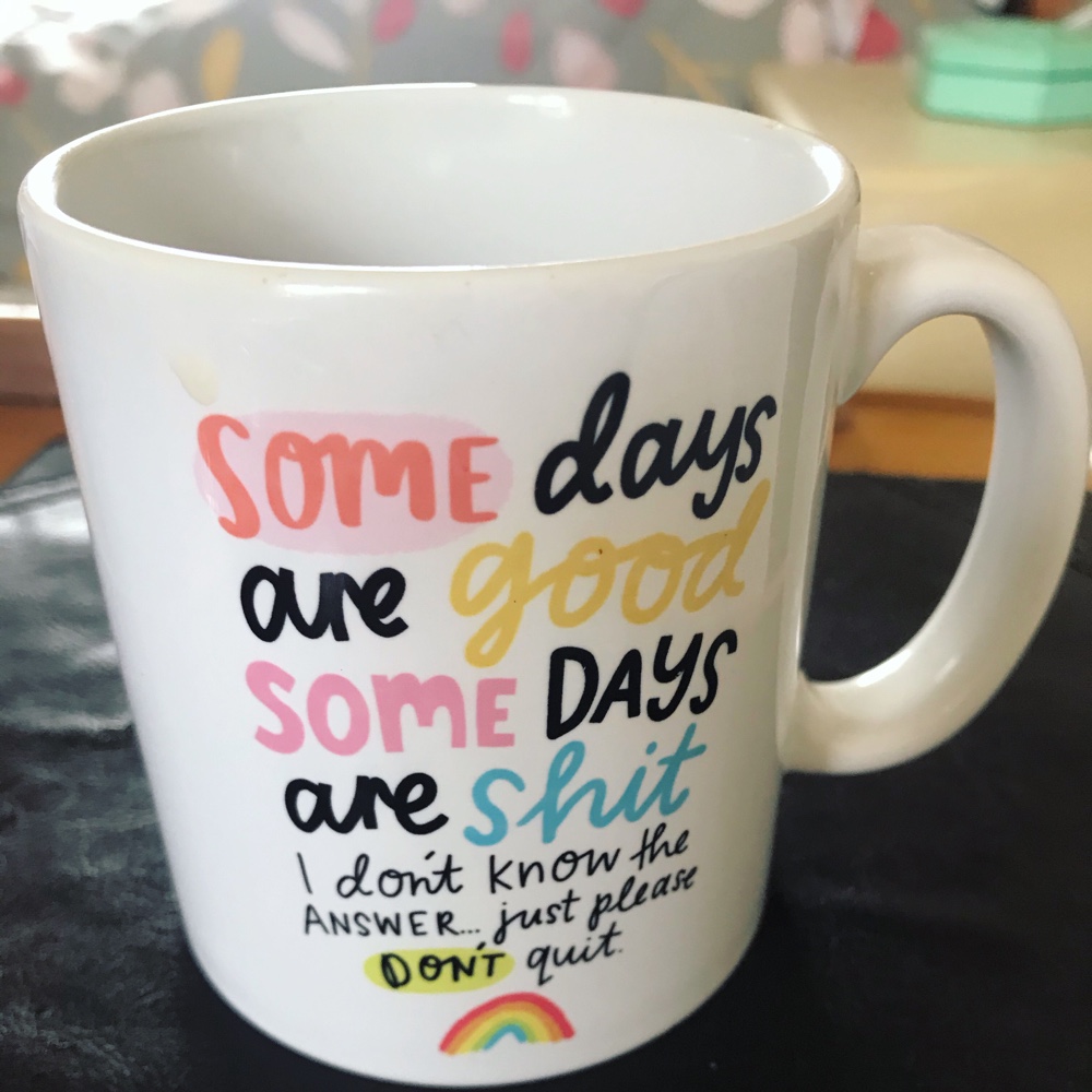 Drinking from my @emilycoxhead mug today and it’s got a message I need to remember and helps me to #nevergiveup 🙃 some days are good, some days are shit, I don’t know the answer… just please don’t quit 🙃
