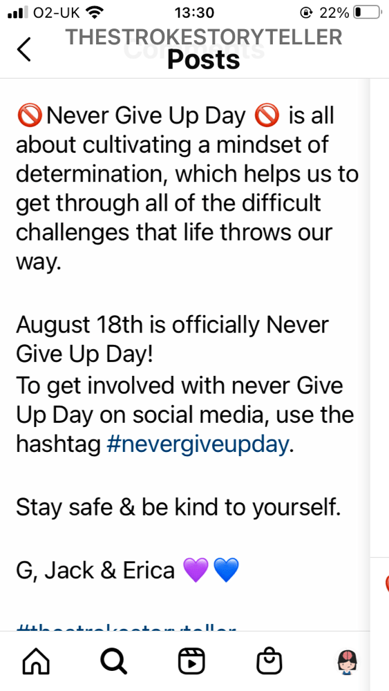 @thestrokestoryteller put up a great encouraging post reminding us to #nevergiveup and remember how far you have come, especially on #nevergiveupday ☺️
