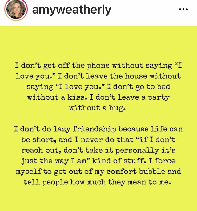 It’s made me think, and from first hand experience of an unexpected brain injury from car accident you never know what is on your/the ones you love and care about paths. Tell people you love them.